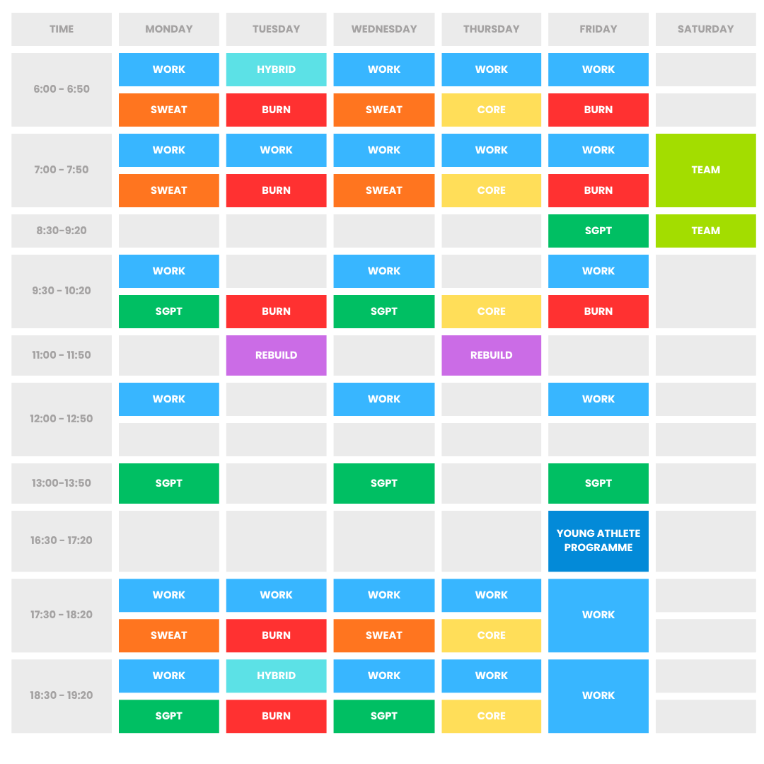 Early morning, mid-morning, lunch, and evening sessions across the week. Something for everyone, every day.